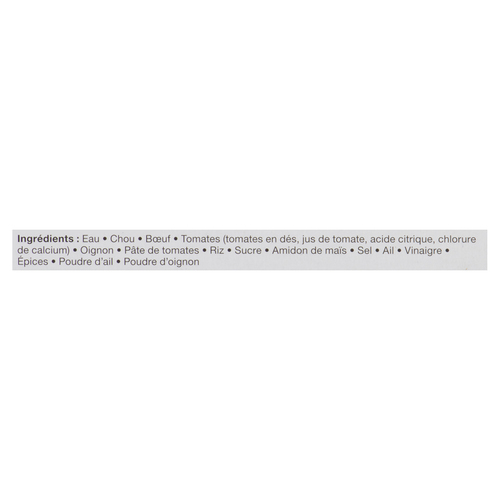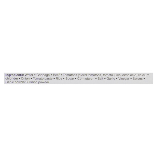 Water, cabbage, beef, tomatoes (diced tomatoes, tomato juice, citric acid, calcium chloride), onion, tomato paste, rice, sugar, corn starch, salt, garlic, vinegar, spices, garlic powder, onion powder.
