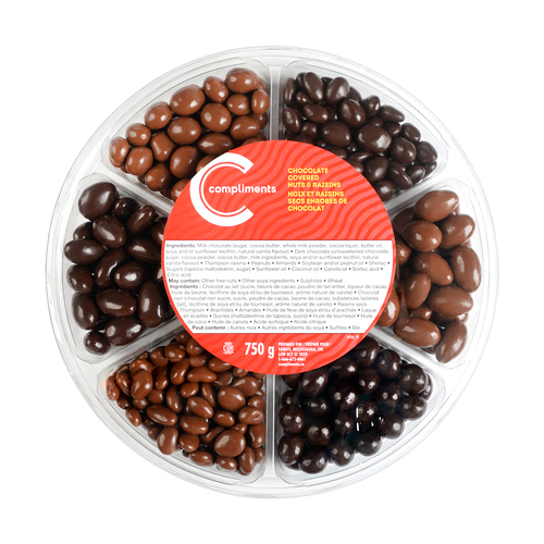 Milk Chocolate (Sugar, Cocoa butter, Chocolate liquor, Skim milk powder, Whole milk powder, Butter oil, Soya lecithin, Natural vanilla flavour), Raisins (Raisins, Sunflower oil), Red Skin Peanuts (Peanut, Soybean oil, Peanut oil), Almond (Almond), Cocoa (Cocoa), Modified tapioca starch, Shellac, Sugar, Coconut oil, Citric acid, Sorbic acid.
