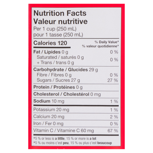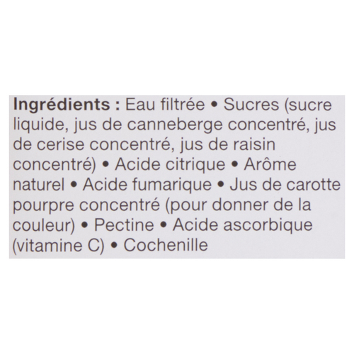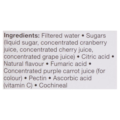 Filtered water, sugars (liquid sugar, concentrated cranberry juice, concentrated cherry juice, concentrated grape juice), citric acid, natural flavour, fumaric acid, concentrated purple carrot juice (for colour), pectin, ascorbic acid (vitamin C), cochineal