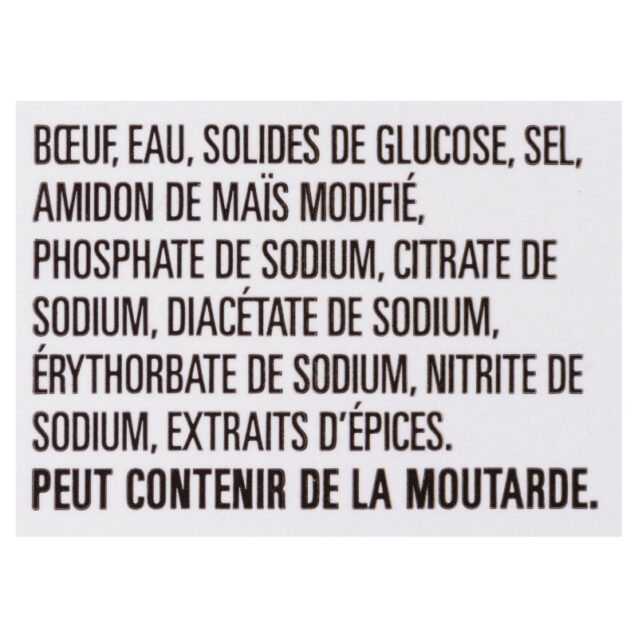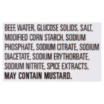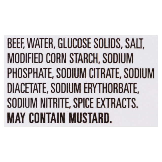 Beef, water, glucose solids, salt, modified corn starch, sodium phosphate, sodium citrate, sodium diacetate, sodium erythorbate, sodium nitrite, spice extracts.