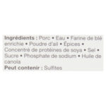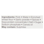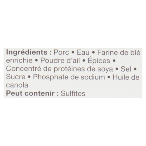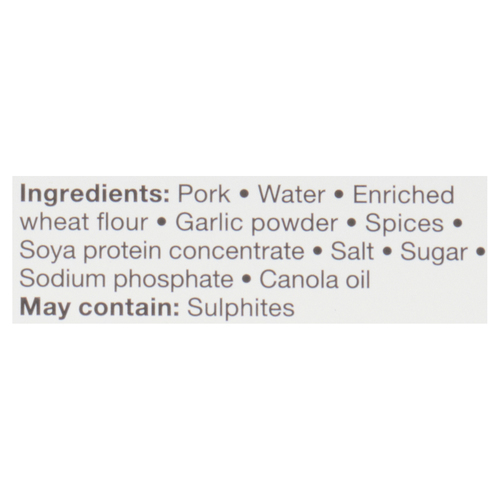 Pork, water, enriched wheat flour, garlic powder, spices, soya protein concentrate, salt, sugar, sodium phosphate, canola oil. MAY CONTAIN: sulphites.