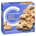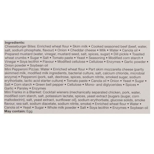 Enriched wheat flour, skim milk, cooked seasoned beef (beef, water, salt, sodium phosphate, flavour), onion, cheddar cheese, milk, water, canola oil, prepared mustard (water, vinegar, mustard seed, salt, spices, sugar), dill pickle, toasted wheat crumbs, sugar, salt, tomato paste, yeast, seasoning, modified corn starch, vinegar, soya lecithin, flavour, modified cellulose, cellulose, enzymes, garlic powder, onion powder, soybean oil.