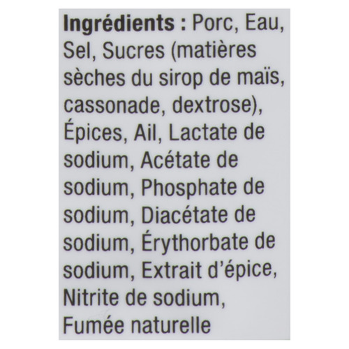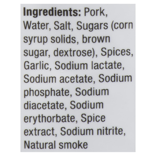 PORK, WATER, SALT, SUGARS (CORN SYRUP SOLIDS, BROWN SUGAR,DEXTROSE), SPICE, GARLIC, SODIUM LACTATE, SODIUM ACETATE,SODIUM PHOSPHATE, SODIUM DIACETATE, SODIUM ERYTHORBATE,SODIUM NITRITE, SPICE EXTRACT, SMOKE