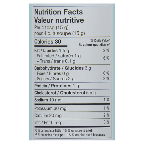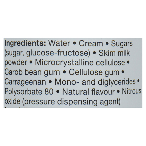 Water, cream, sugars (glucose-fructose, sugar), skim milk powder, cellulose, carob bean gum, cellulose gum, carrageenan, mono- and diglycerides, polysorbate 80, natural flavour, nitrous oxide (pressure dispensing agent)