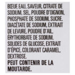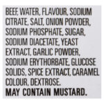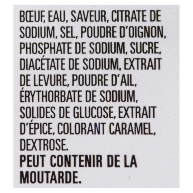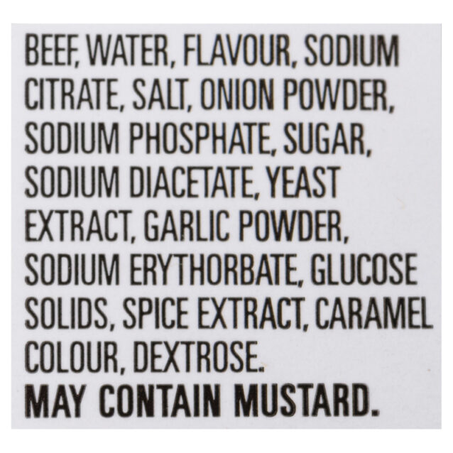 BEEF, WATER, GLUCOSE SOLIDS, SALT, MODIFIED CORN STARCH, SODIUM PHOSPHATE, SODIUM CITRATE, SODIUM DIACETATE, SPICE EXTRACTS (CONTAIN MUSTARD), SODIUM ERYTHORBATE, SUGAR, DRIED GARLIC, SODIUM NITRITE, SMOKE.